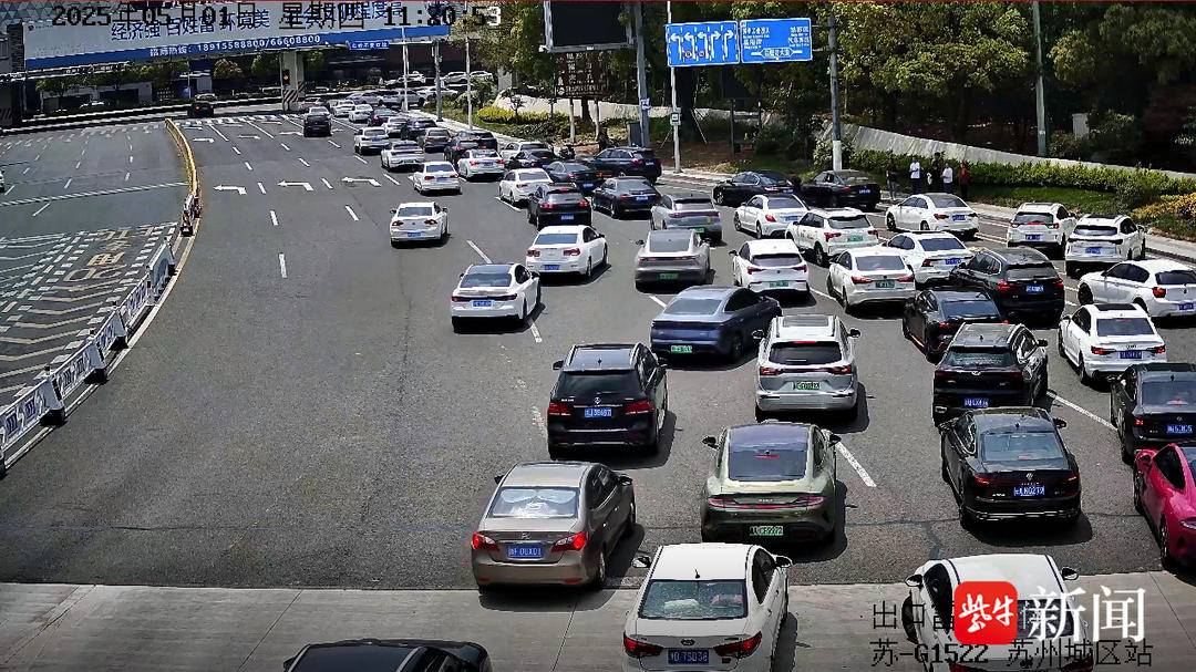 西山收费站监控画面 由于拙政园、平江路、苏州博物馆等热门景点集中分布在苏州古城区,假期首日,苏州城区收费站前往古城区方向的车流量激增,当日上午10:00-11:00,收费站小时总流量达3283辆次,出口右转车道出现明显排队现象。
