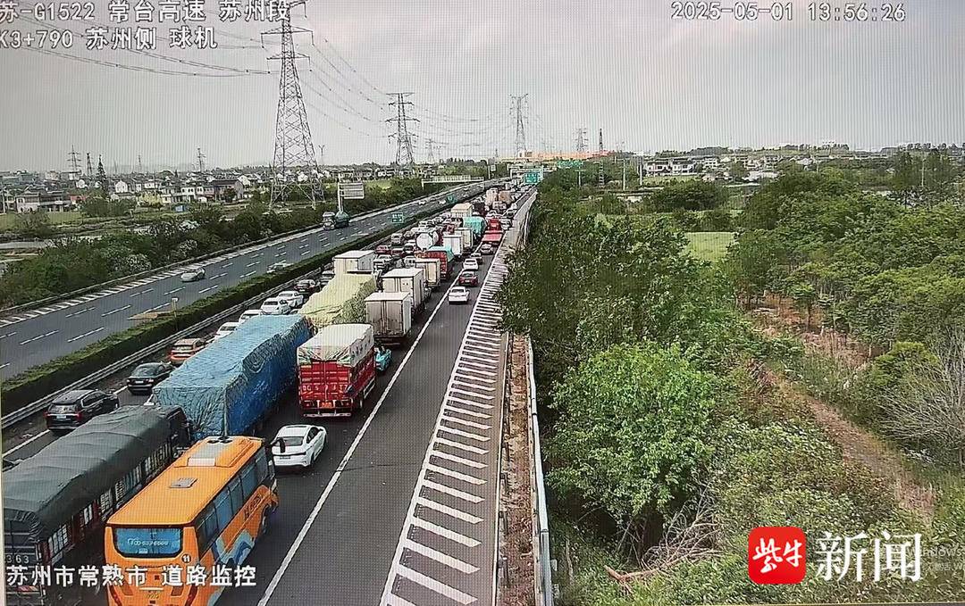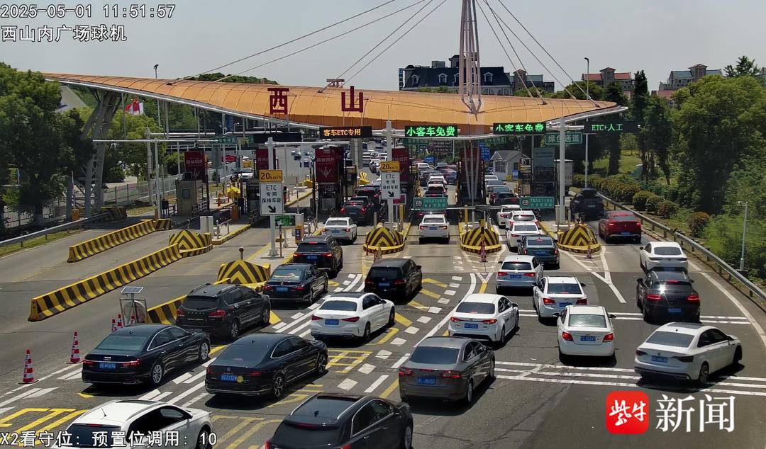 常台高速董浜至苏通大桥段监控画面 5月1日上午,热门收费站“时段集中、潮汐明显”的特征显著,苏州城区收费站、西山收费站、石湖收费站等收费站迎来客流高峰,一度出现排队现象。其中,西山收费站出入口车流高峰时段出现在9:00-12:00,截至下午3点,收费站流量达2.2万辆,同比增长16.51%。